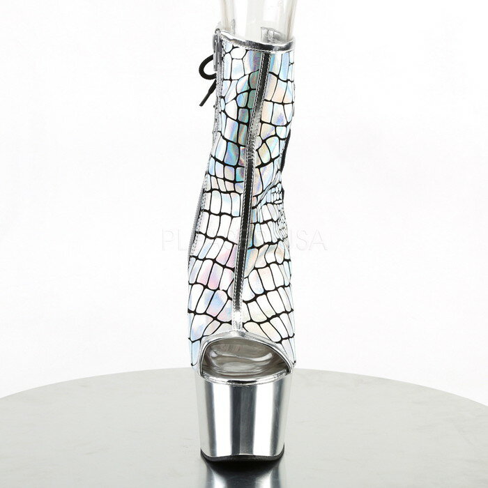 厚底ショートブーツ(レディース)の説明 アメリカのメーカーPleaser(プリーザー)の厚底ショートブーツです。 後ろ側がレースアップで、サイドジッパー付き。 つま先とかかとがオープンになったデザインです。 靴の表面は、ホログラム加工のシルバー色、鳥肌のような柄です。 厚底部分は、シルバー色のクローム加工。 店長(女性)の試着評価 なし 厚底ショートブーツ(レディース)の詳細 ブランド: PLEA...
