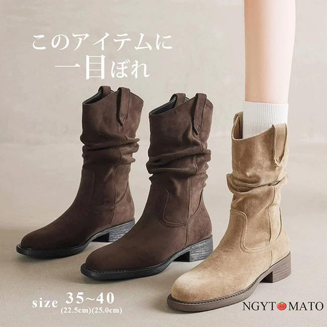 履きやすい カジュアル 筒太め ウエスタンブーツ ミドル丈 ブーツ くしゅくしゅ スエード調 ラウンドトゥ 太めヒール レディース