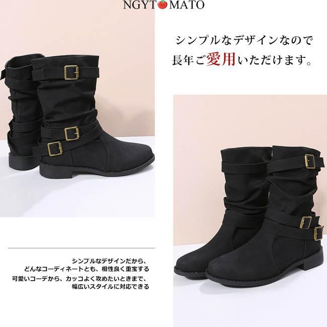 歩きやすい 履きやすい PU 柔らかい 筒太め くしゅくしゅ ミドル丈 ベルト 男女兼用 エンジニアブーツ ラウンドトゥ ローヒール