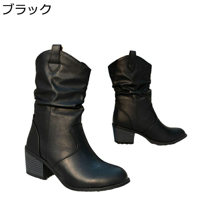 ウェスタンブーツ レディース ミドルブーツ 秋靴 レザー 冬 ウェッジ くしゅくしゅ 無地 ポインテッドトゥ チャンキーヒール 防寒 美脚 ウェスタン おしゃれ コスプレ イベント 通学