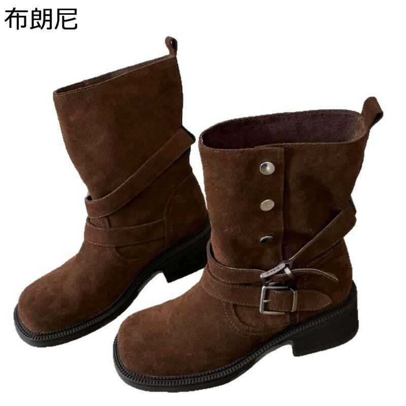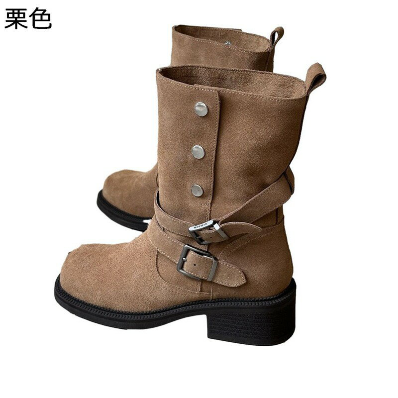 レディース ジョッキーブーツ ミドルブーツ 美脚 レザー 丈夫 防寒 ベルト飾り 牛革スエード ラウンドトゥ 安定感 デイリー 身長アップ チャンキーヒール 秋冬 通勤 通学 イベント レトロ調